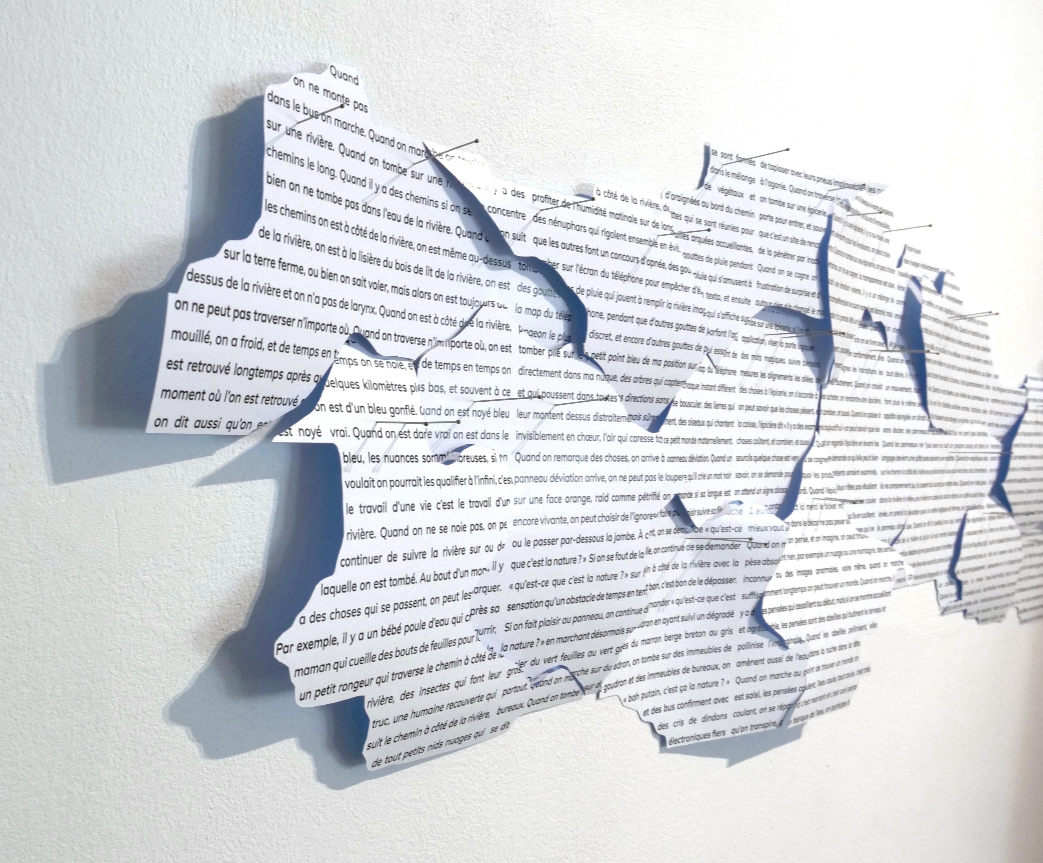 Mis en page sur une frise et imprimé sur papier dos bleu, le texte est découpé selon les motifs de reflets d'eau tracés à main levée par l’artiste. Il est ensuite épinglé au mur avec des épingles entomologiques, tel un geste de naturaliste qui se pique du réel et souhaite le conserver dans un état fixe, photographique. Les fragments décollés du mur créent des écarts avec lesquels le lecteur doit jouer pour lire : il se déplace pour trouver l'anamorphose, il est mis en mouvement, sa lecture n'est pas « livrée » mais devient performative, afin de compenser les décalages qui perturbent la lecture. Le corps est engagé dans l’acte de lire, devient rivière comme le geste de dessin - telle une signature spontanée - est lui aussi devenu rivière.Le dos bleu du papier fait légèrement rayonné les fragments, donnant à la matière du texte une profondeur, non seulement surface.